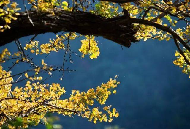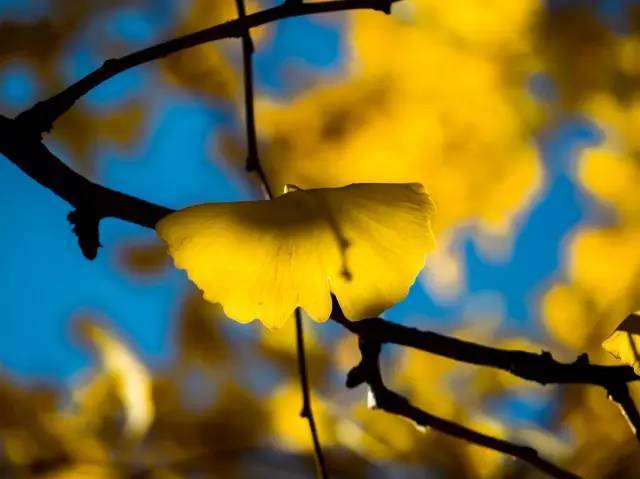 拍逆光同样对背景的色彩考虑也很重要,一般深色的背景会使逆光的效果更好。如果有蓝天,用蓝天做背景,冷暖反差的对比,银杏叶色彩会更饱满而且通透。