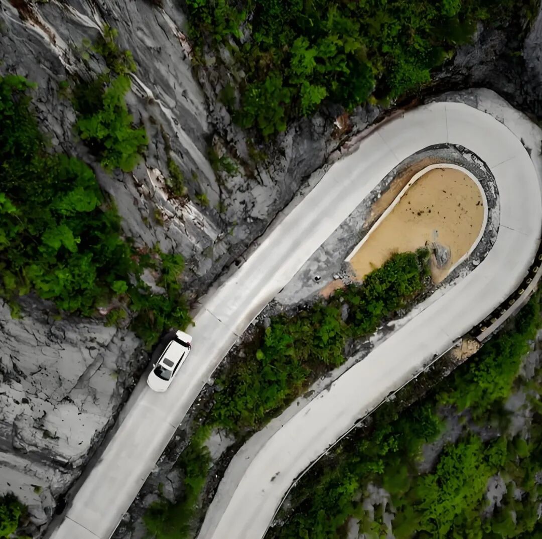 沿着美国道G351驶向五峰,首先你会遇见千丈岩。灰白色的绝壁几乎垂直地从路边拔起,这一程自驾的乐趣体验开始了。当道路收紧、山势陡起,方向盘在手中变得格外真切。每一段贴着岩壁的弯道,都让心跳随视野收紧,然而这不是征服,而是一场专注的共舞。