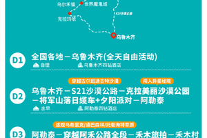 温馨提示:今日到达乌鲁木齐时间大概为17:00左右,可直接送到乌鲁木齐机场、火车站或市区指定酒店。今日行程不含住宿。大家可根据自己的时间,自行选择返程时间。